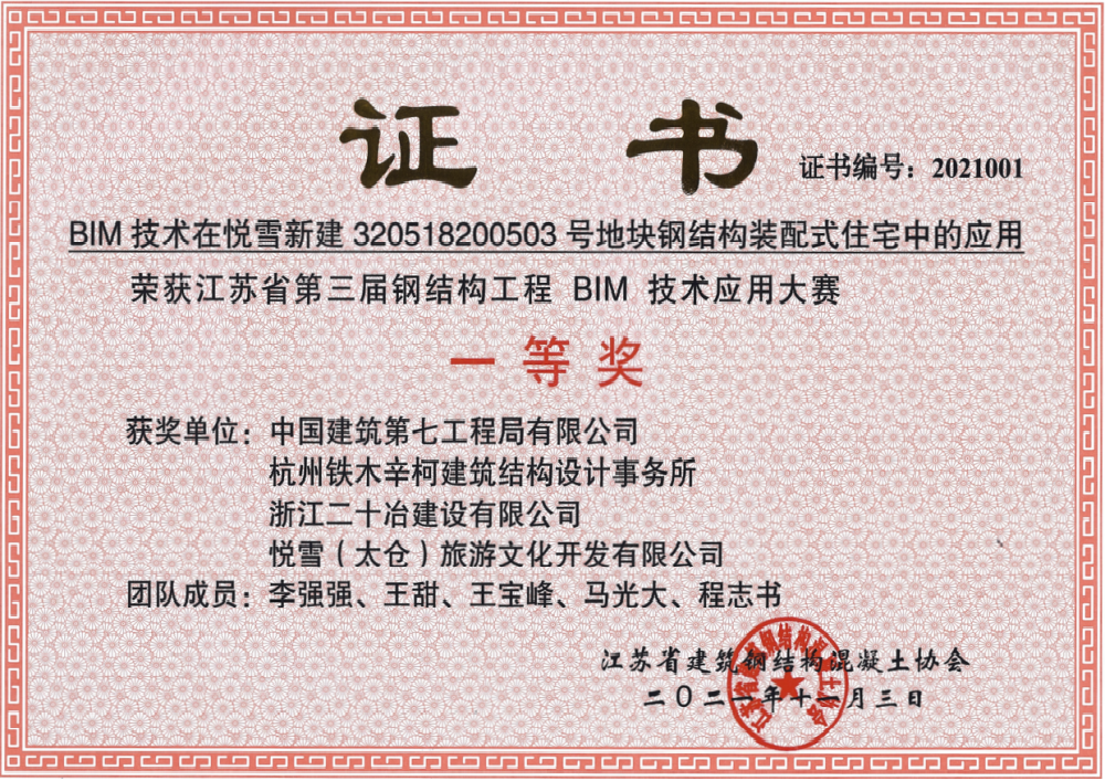 江蘇省第三屆鋼結構工程BIM技術應用大賽一等獎