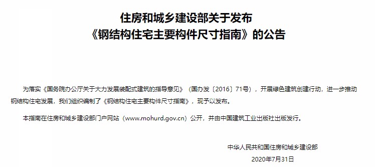 住建部科技與產業化發展中心和住宅產業化促進中心主編了《鋼結構住宅主要構件尺寸指南》,規定了住宅中常用構件的類型、規格表,希望原材料廠家能提供標準化型材,設計單位能選用,形成良性循環,共同提高部品的標準化水平,降低過程成本。