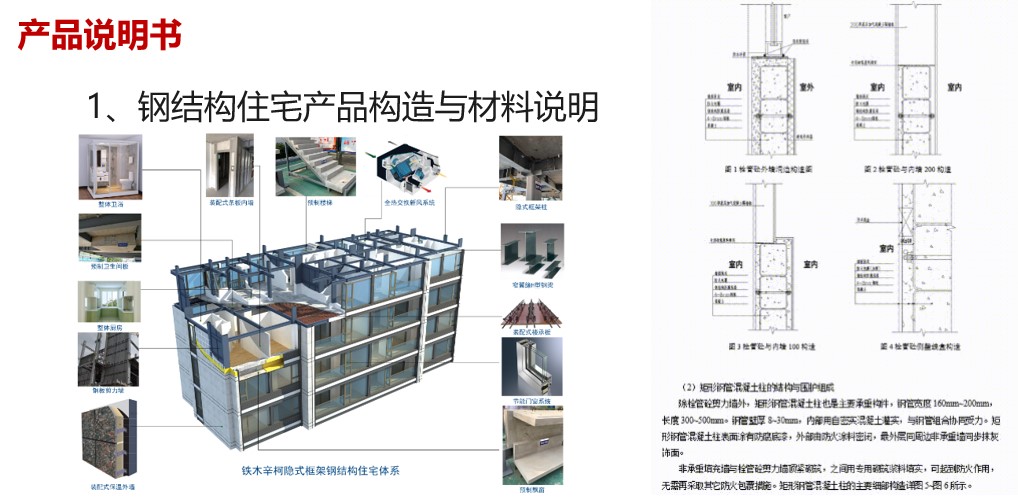 1、鋼結構住宅產品構造與材料說明。鋼結構住宅應用較多新材料、新部品、新技術,盡量向用戶開誠布公的講清楚,免得用戶不了解產生誤會。比如輕質隔墻、各類保溫做法、防火做法、裝配式裝修做法等,不一定講很深的技術細節,要講清楚這些材料選用、構造做法的重要性、設計依據的國家規范圖集等。之前國內發生過用戶認為輕質保溫材料是建設方偷工減料的案例。