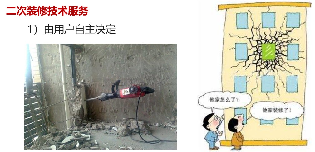 1、目前市場上常見的做法是由客戶自主決定。這就存在用戶盲目裝修的情況,這也是目前大家最關注的問題,怕出各種各樣的問題,這是應該努力避免出現的。