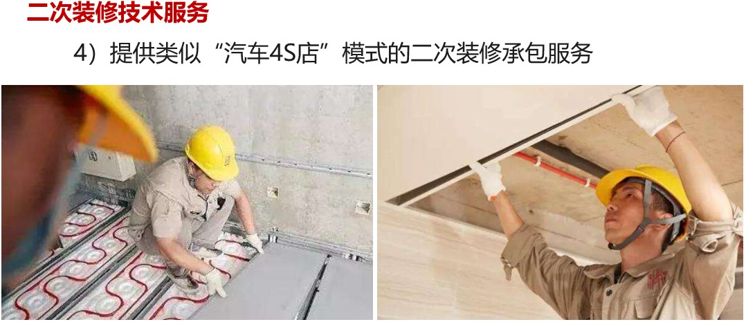 4、最優的方案是提供“汽車4S店”類的二次裝修承包服務,這種方案適用于高端精裝修交付的住宅產品。此類產品面對的是高端用戶,產品的材料選用都是有品牌的,構造做法比較講究,最好是由原裝修單位提供維保以及二次改造的設計和施工,這樣才能在材料品牌選用、構造合理性以及施工細節方面為用戶提供高品質的服務。