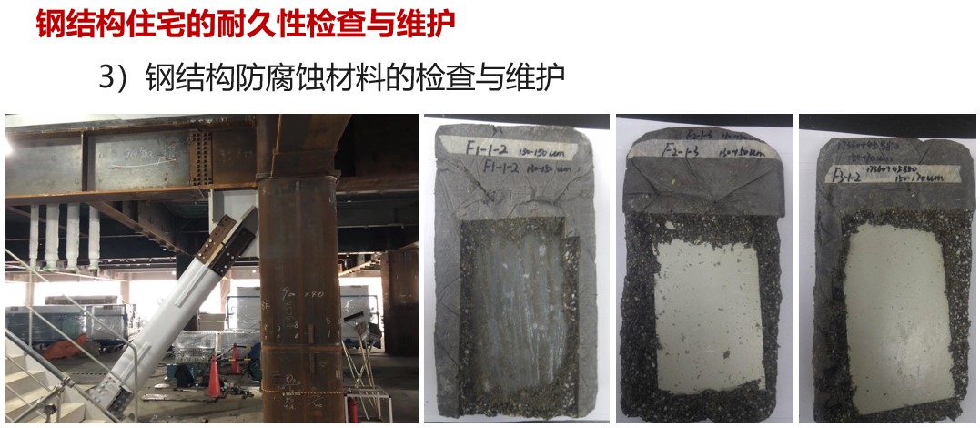 3、鋼結構防腐蝕材料的檢查與維保。市場最關注的是鋼結構的防腐蝕材料的耐久性檢查與維保問題,因為這個問題表面看起來處理最麻煩。市場對此問題的擔心多是因為不了解相關的技術細節,加上設計規范、產品規范的應用場景不同,產品的耐久性指標不同,給市場帶來困擾。研究表明,鋼結構在正常防腐蝕涂裝以及防火涂料保護下,耐鹽霧實驗可達2000小時,能滿足住宅設計基準期的要求。目前國家正在修編鋼結構住宅的防腐蝕相關規范標準,從所處的環境、防腐蝕做法、耐久性指標以及檢查維護等,給出更詳細的指導。由于鋼結構住宅服役期都較短,目前還不到防腐蝕耐久性檢查的階段,相信新版規范標準的出臺能及時解決公眾關心的這個問題。