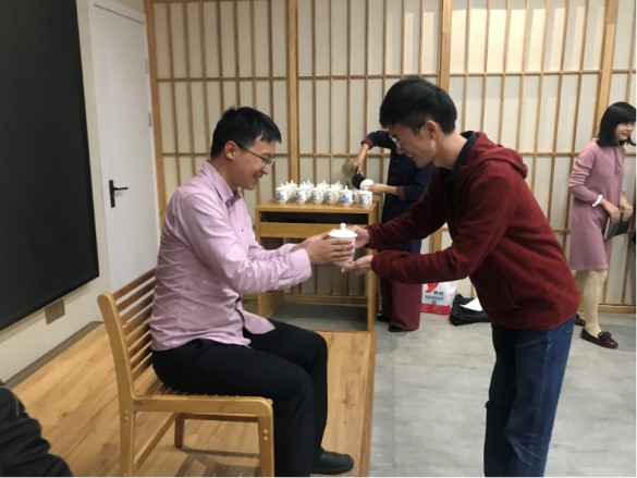 接下來是敬茶環節,徒弟們為各自的師傅敬上一杯茶,同時師傅回贈徒弟書籍并合影留念。